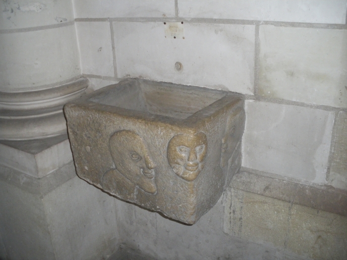 Près de la porte latérale, un beau bénitier du XIIIe siècle, orné de trois têtes humaines grossièrement sculptées de profil, est fixé au mur.